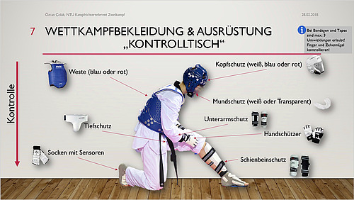 Natürlich trägt jeder Wettkämpfer einen weißen Dobok und einen Gürtel. Um sich beim Wettkampf vor Verletzungen zu schützen tragen die Kämpferinnen und Kämpfer Arm- und Schienbeinschöne. Damit die Kraft der Tritte ein wenig abgeschwächt wird, gehört eine Kampfweste und ein Kopfschutz zur Ausrüstung.